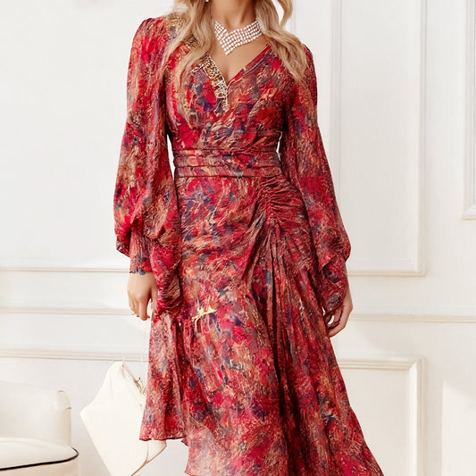 Rochie imprimată cu mâneci bishop și decolteu în V