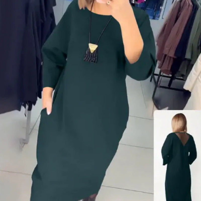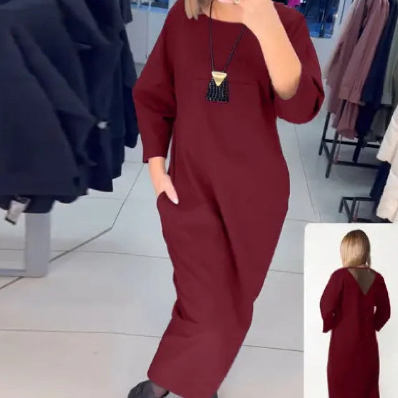 1 * Femei culoare solidă buzunar gât rotund rochie cu mânecă lungă