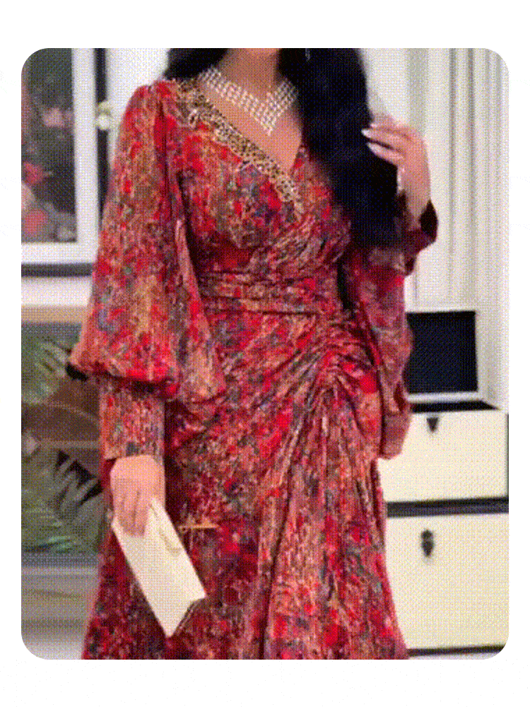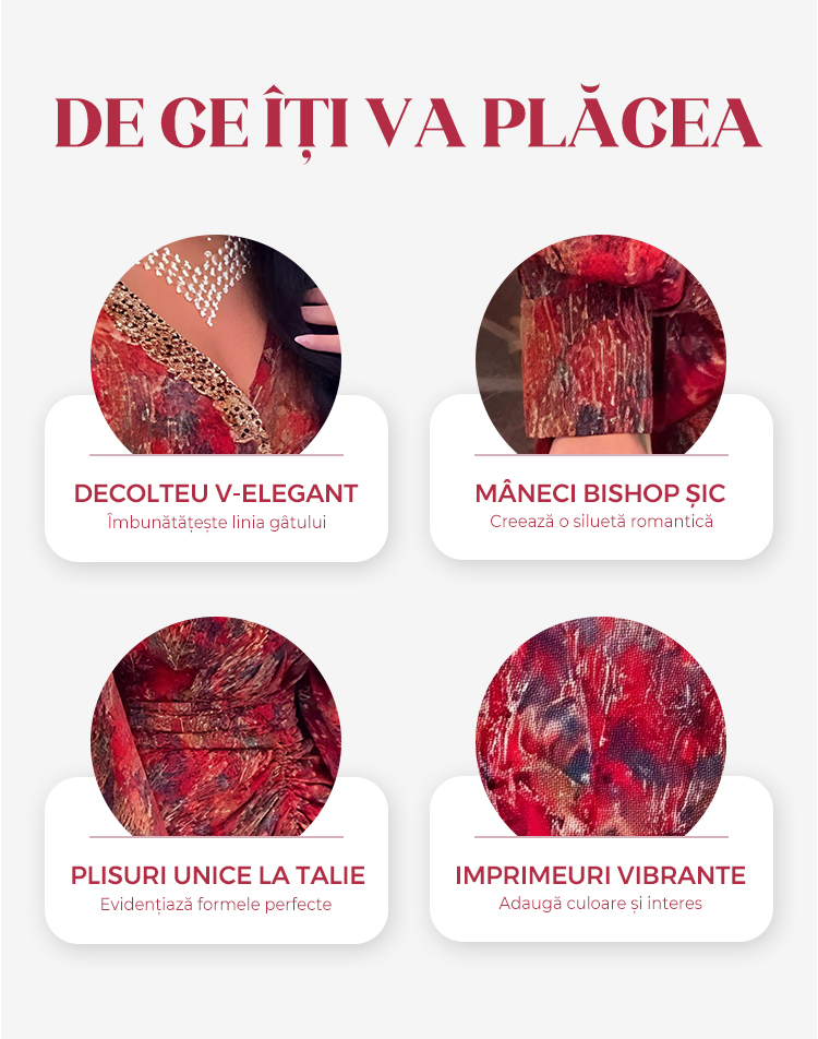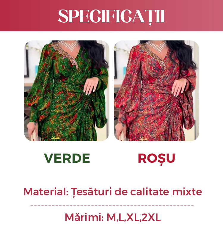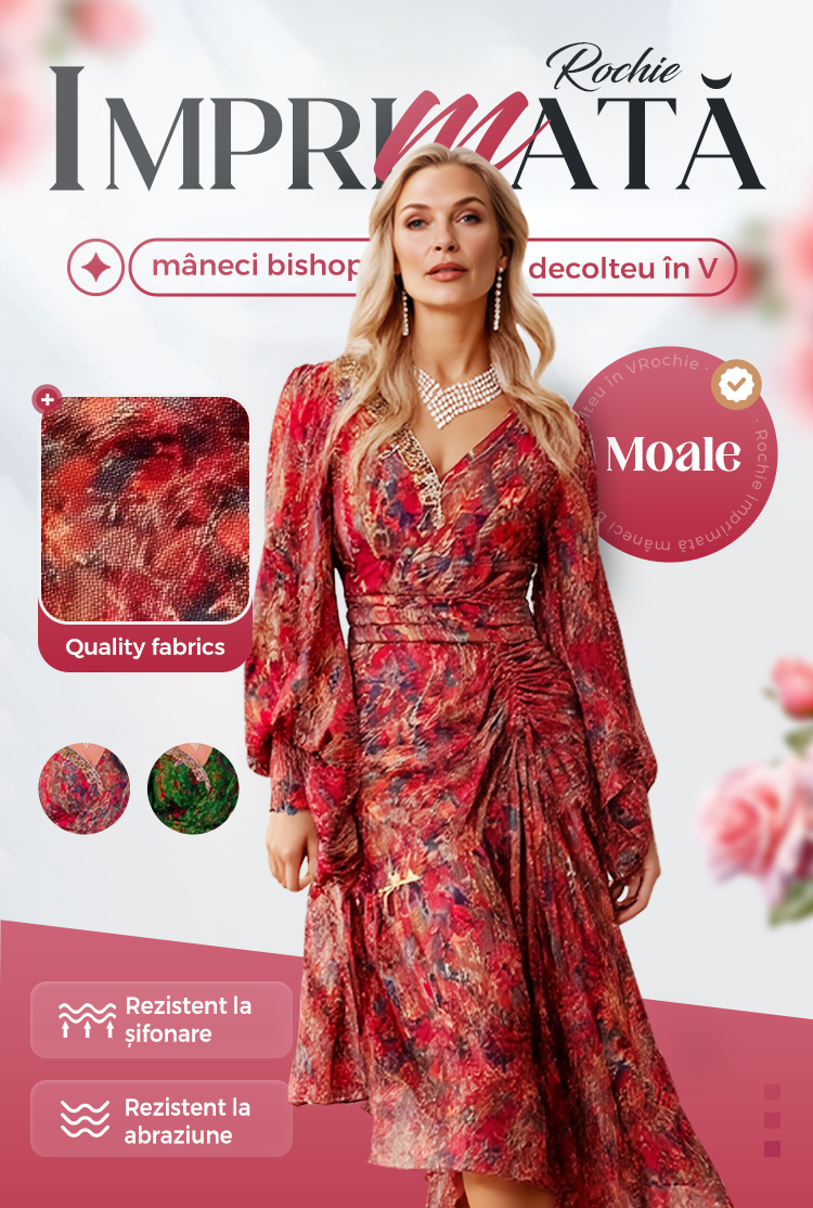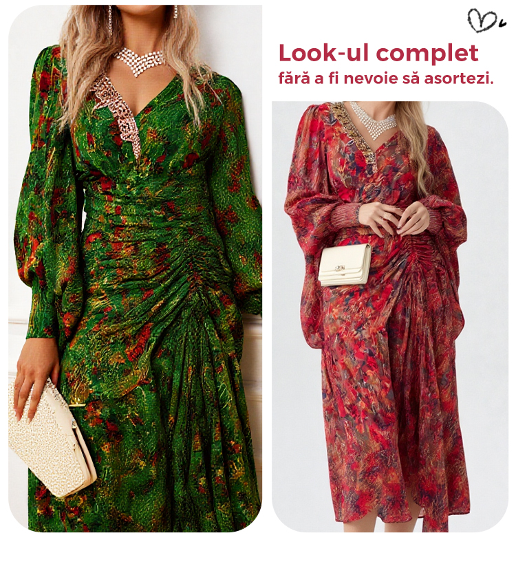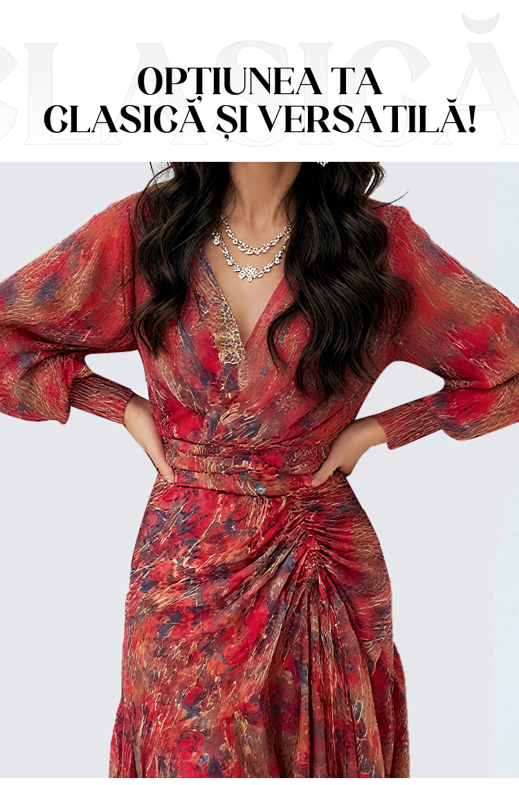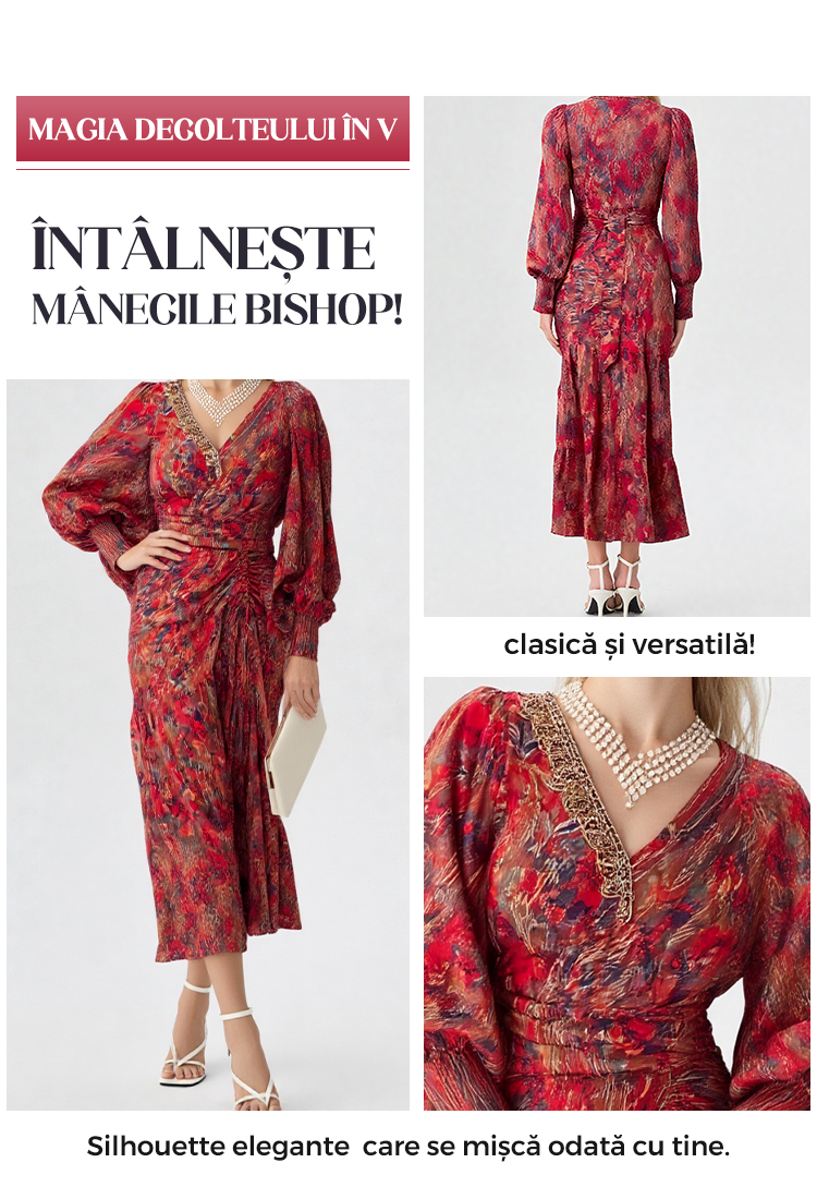 Rochie imprimată cu mâneci bishop și decolteu în V