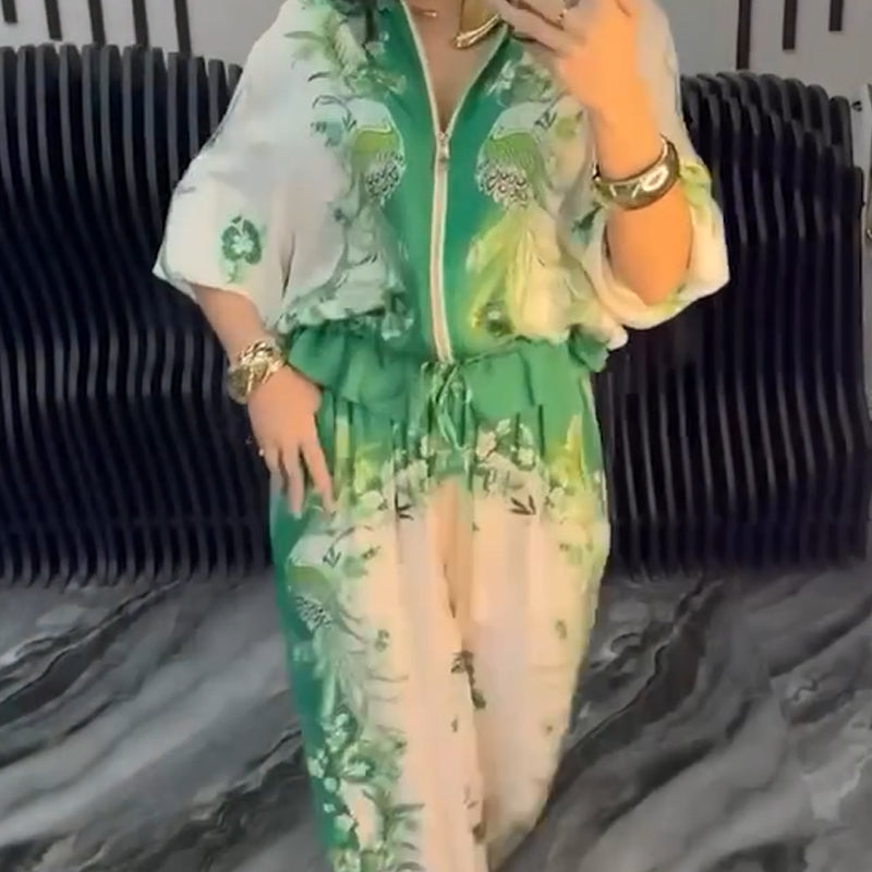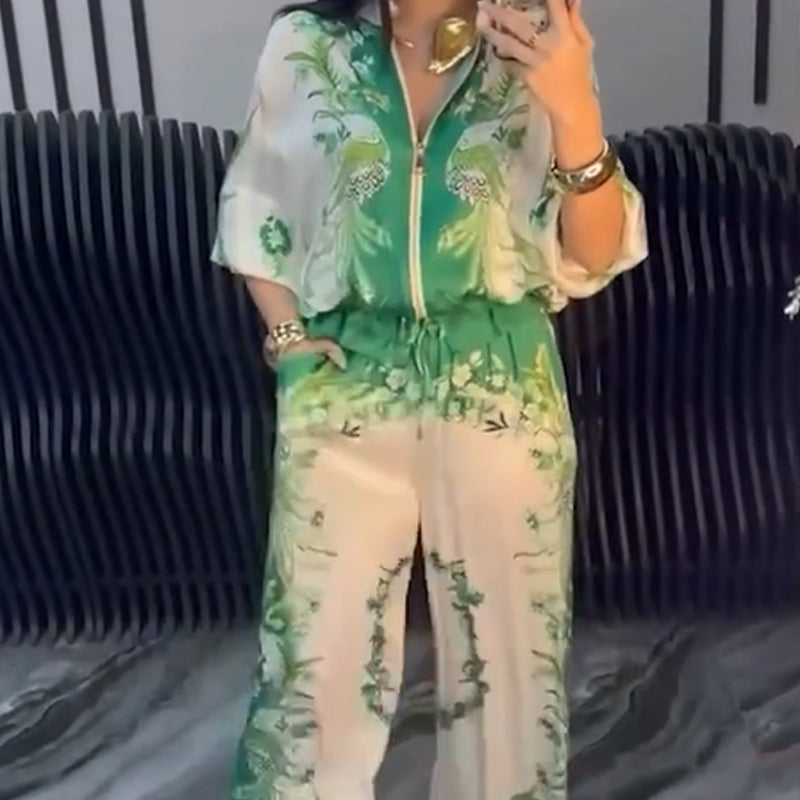 Fitrat confortabil cu stil: Proiectat cu un top cu mânecă kimono-potrivită relaxat și pantaloni elastici cu talie, această ținută asigură confortul de toată ziua, fără a face compromisuri la modă, perfectă pentru relaxare sau ieșire.